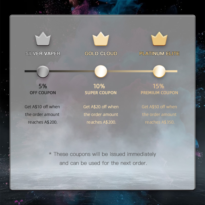 Whether you're a newbie to e-cigarettes or a long-time fan, sign up and enjoy the member price right away. Get A$5 off your first order, and unlock amazing benefits as you level up!