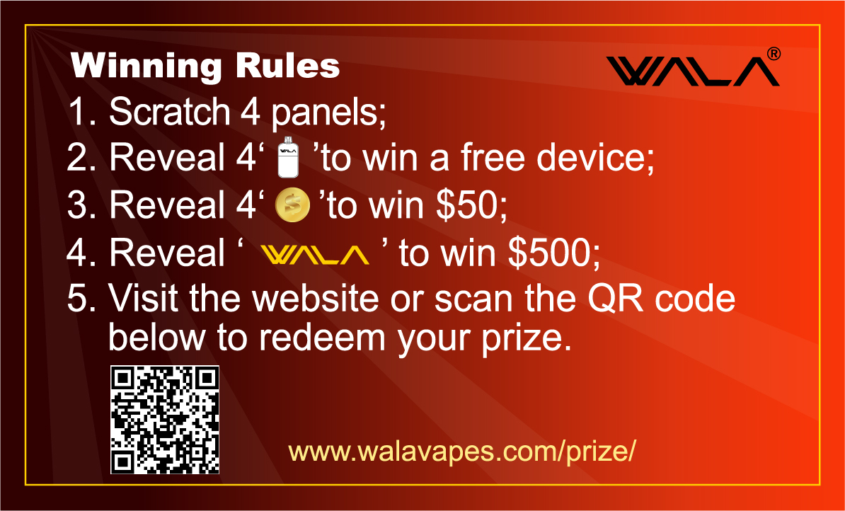 If you’ve recently picked up the WALA POP 10,000 Puffs, you’re in for more than just an incredible vaping experience—you now have the chance to win prizes worth up to $500 through our exclusive Scratch & Win Card Giveaway! 🎉